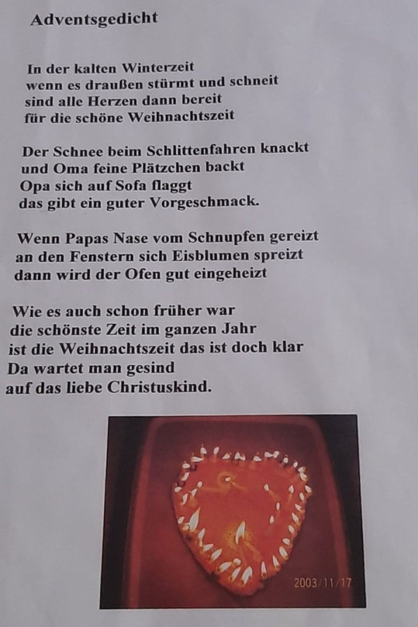 Heute gibt es wieder ein Adventsgedicht von unserer Jana ("23"), welches sie im Internet gefunden hat.