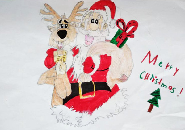 Heute erscheint der Weihnachtsmann mit seinem Rentier, gemalt wurde dieses tolle Bild von Lena (10) von unseren Goldfunken.