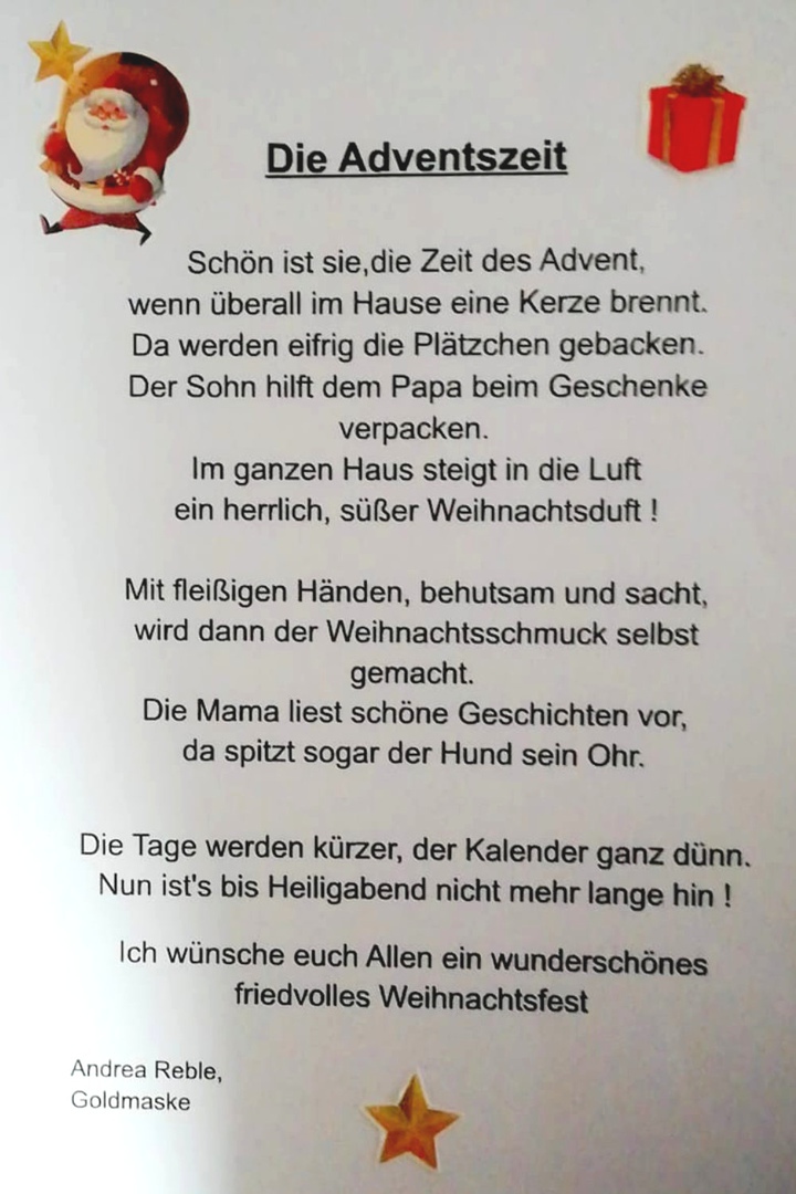 Tag 2 unseres Kalenders verbirgt ein selbstgeschriebenes Gedicht unserer Goldmaske Andrea Reble ("23")