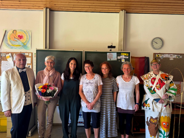 von links: Rolf Nagel (Ehrenpräsident der PFG) , Christiane Lohmann (Stellvertretende Schulleitung), das Klassenteam
